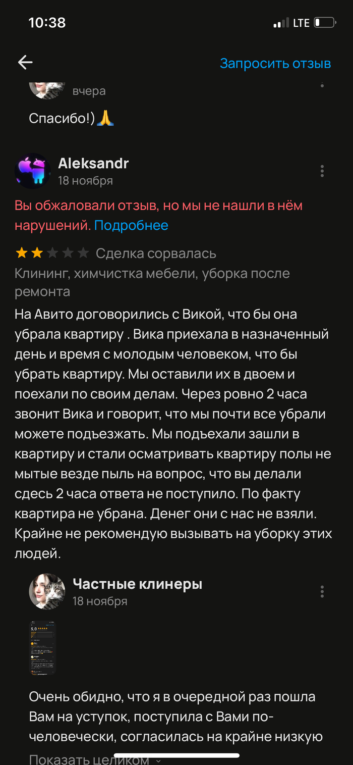 Авито, я прошу хотя бы скрыть этот отзыв, чтобы он не влиял на рейтинг, раз для Вас это «мнение клиента». Вам самим не кажется странным то, что человек сначала оставлял положительный отзыв, нахваливал до невозможности, а потом резко его что-то не устроило, и мы якобы «даже пыль не протерли» чем же мы занимались тогда?
