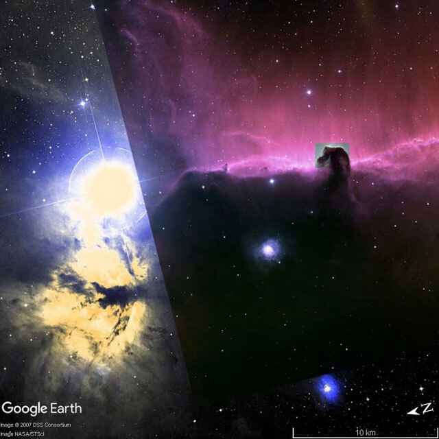 Туманность Конская Голова (Horsehead Nebula) – первое место в новой рубрике «Интересные места Google Sky» – приложения Google Earth, в котором можно просматривать звёздное небо, заснятое орбитальными телескопами, такими как Хаббл. Туманность Конская Голова – одно из потрясающе красивых мест, снятых в высоком разрешении для Google Sky. Туманность представляет из себя тёмное пятно в форме конской головы, состоящее из плотного слоя пыли, поглощающего свет, а фиолетовое свечение позади туманности является результатом ионизации водородного газа излучением ближайшей яркой звезды в созвездии Ориона.