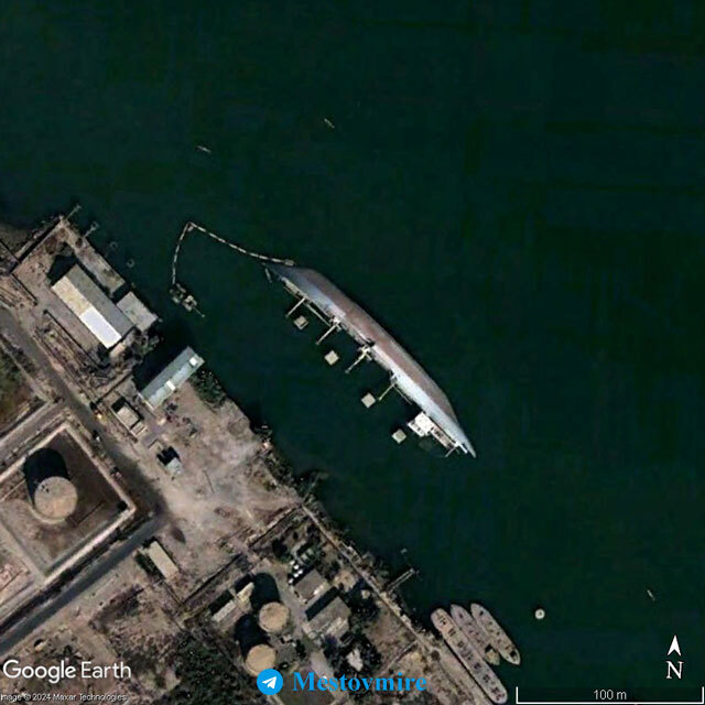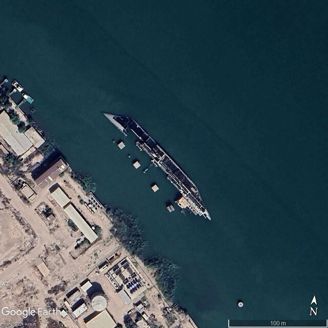 В настоящее время уже почти разрезанный на металлолом. Сверху непонятно, был ли он специально затоплен, или его разбомбили, видно только, что от корабля отходит какое-то понтонное ограждение или шланг для откачки топлива.