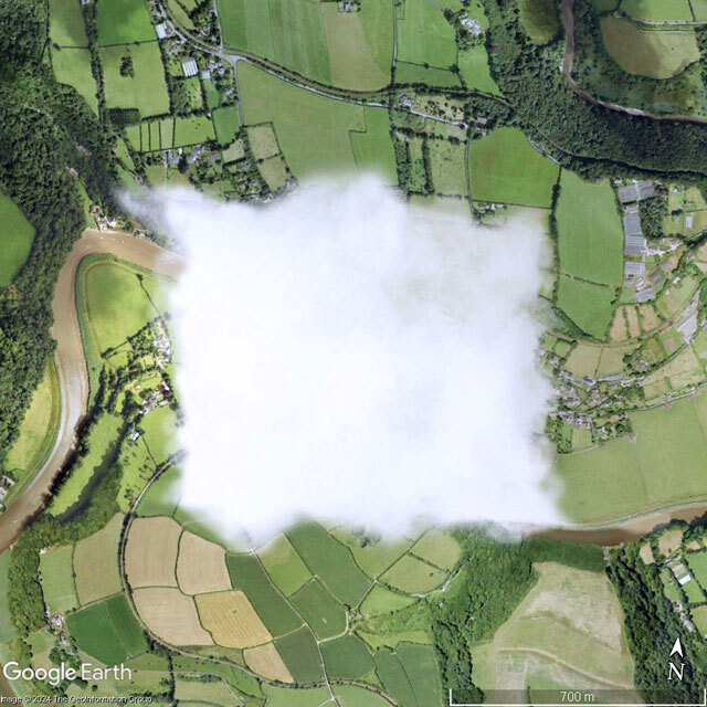 было снято 31 декабря 2005 года над городком Калсток. Либо это уникальное явление природы, либо очень необычная цензура от специалистов Google для сокрытия местности под облаком. Хотя там нет ничего интересного, судя по второму снимку сделанному в другое время.