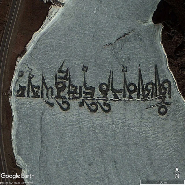 появились в 2013 году. Длина надписи 350 метров. Больше всего эти письмена мне напоминают надпись внутри кольца в к/ф «Властелин колец» 😁. Возможно надпись выполнена на тибетском языке.