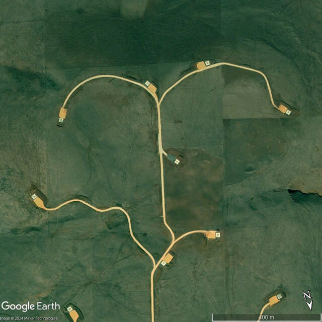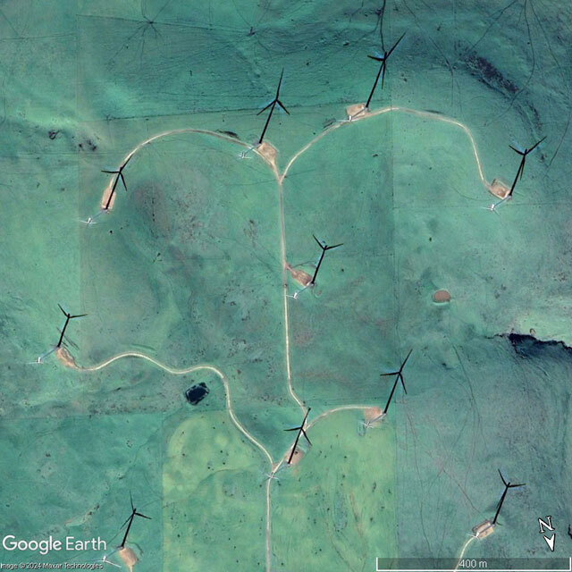 На самом деле на вершинах холмов, к которым подведены USB, стоят ветрогенераторы. На втором более позднем снимке они уже хорошо видны.