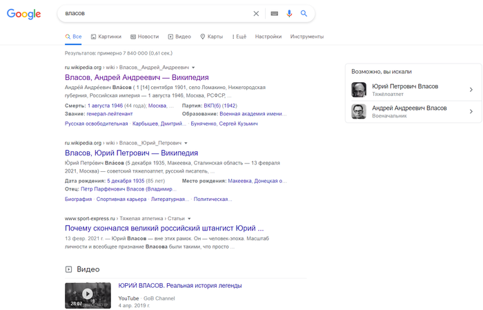 Недавно умер Юрий Петрович Власов. Хотелось восстановить память о нем, или узнать, что то новое. Сделал два запроса...