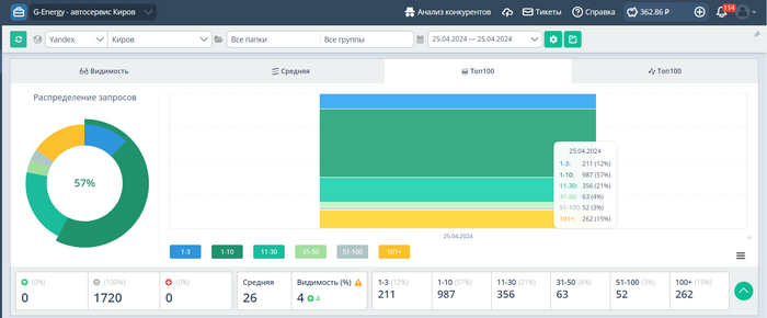 - 987 запросов находятся в ТОП 10 поисковой выдачи;