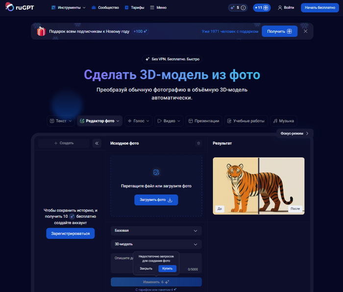 Во многих сервисах, включая агрегатор нейросетей ruGPT.io, достаточно загрузить подходящее фото — и система автоматически строит объёмную модель, определяя глубину и форму объекта. Это удобно, если у вас нет опыта работы в 3D-редакторах и нужен быстрый и понятный инструмент.