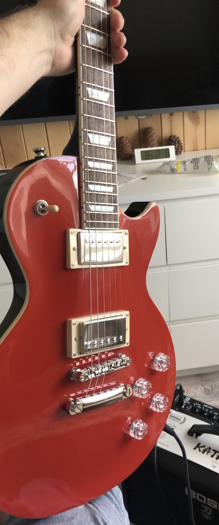 - удобная форма, многие говорят что он выглядит как LP но ощущается как страт. Мне его просто удобнее держать, он не мелкий и не выпадет к меня из кривых ручонок,