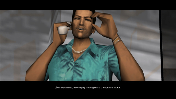 Если сравнивать с тройкой, то качественный скачок на лицо. И гг разговаривает, и в катсценах происходит какой-то движ, и графика стало лучше. Завязка сюжета такова. Итальянские мафиози проворачивали сделку с наркотой, но что-то пошло не так. На Томми Версетти повесили долг. Так и начинает путь игрока на вершину преступного мира города Вайс-сити. Знакомимся с персонажами и выполняем их поручения, чтобы нам помогли узнать кто виноват, а что делать мы уже и так знаем. Среди знакомых будут и военные, и политики, и наркобароны и даже звезды рок музыки. Со временем у нас появится друг Лэнс Вэнс. Он дает наводку что подставил нас Диаз. Убрав его совместно с Лэнсом, последний пропадает с радаров. И будет только звонить на телефон и жаловаться, что Томми плохой босс. Тут наступает филирная часть сюжета, потому что на нас сбрасывают второсортные поручения чтобы прибрать чужой бизнес к рукам или вступить в бандитские разборки.