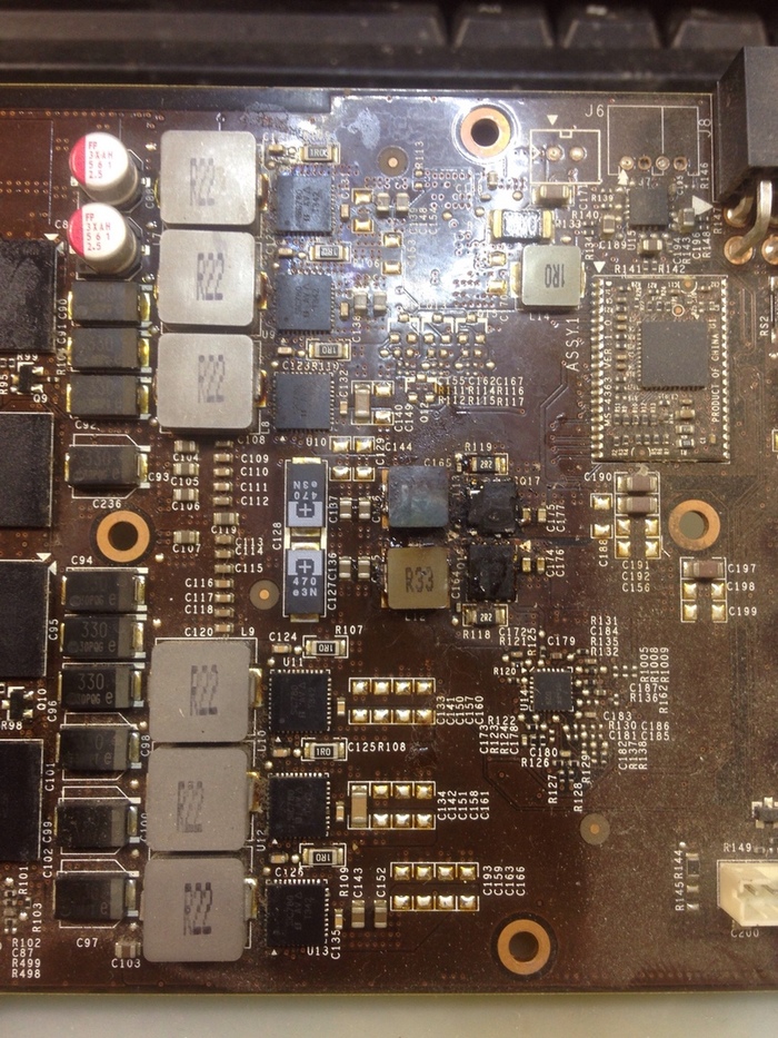 Итого, под замену все банки памяти. Видеочип по опыту тоже вряд ли выжил. К сожалению такая видеокарта ремонту не подлежит.