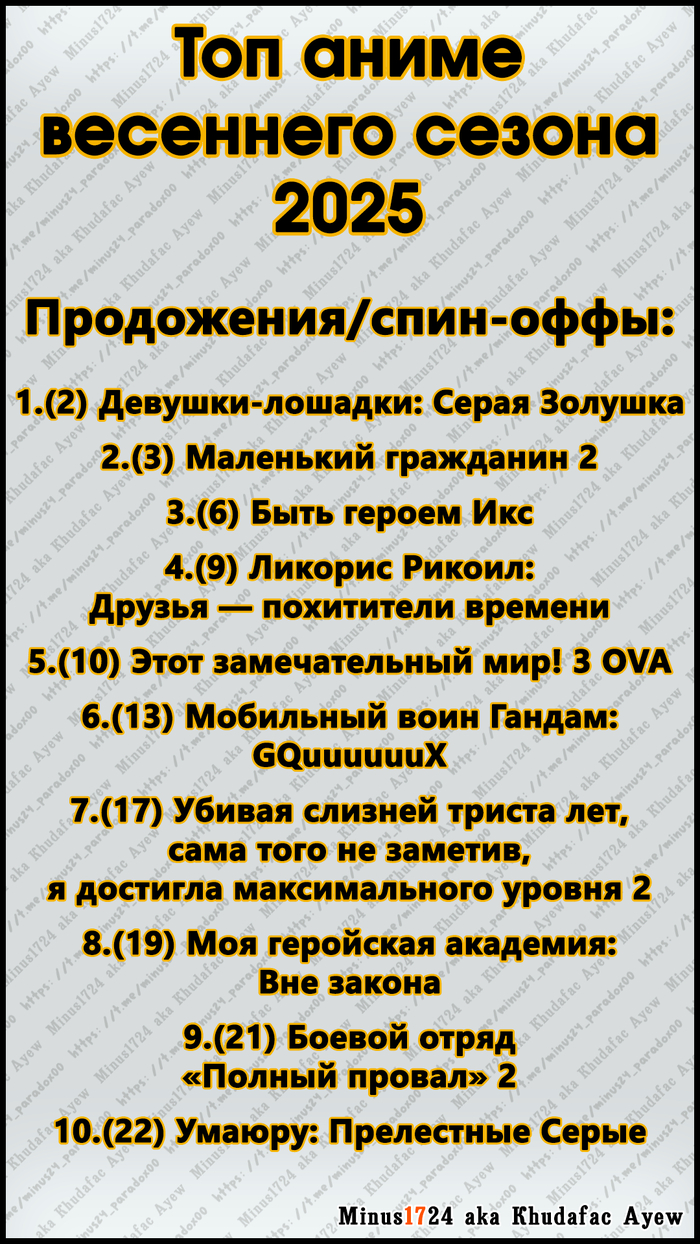 Я так понял что обзоры сезона здесь не особо кому-то нужны и многим просто лень их читать. Поэтому вот более простой для восприятия формат. Здесь два топа. Новинки и продолжения/спин-оффы. Цифра в скобках, это общее место тайтла в моём топе сезона. Монолог фармацевта был в моих итогах зимы, поэтому в топе весны его не будет, а если бы был, то наверное в топ 3 продолжений. И да топ получился очень субъективным. Но на то он и личный топ.