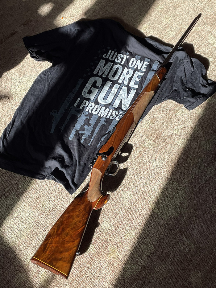 Утащил в машину, поехал за женой, которая в это время ходила по своим магазинам. И так совпало, что пока я покупал себе винтовку, она мне купила футболку c шуткой как раз про то, что я трачу много денег на оружие. :-) Получилось весело и прямо в кассу. ))
