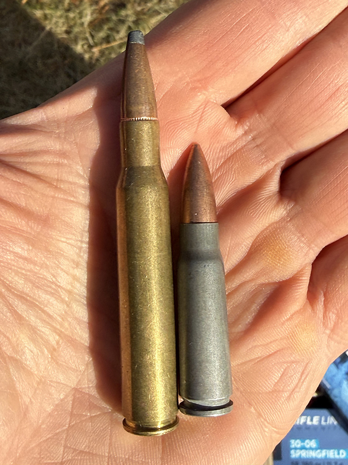 Калибр 30-06. Это 7.62x63мм - здоровенный старый патрон, который использовался армией США в обе мировые войны, во многих других конфликтах, как в пулемётах, так и в винтовках. Он также остаётся популярным среди охотников.