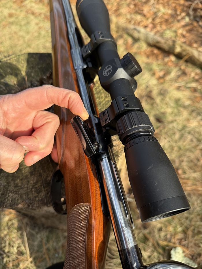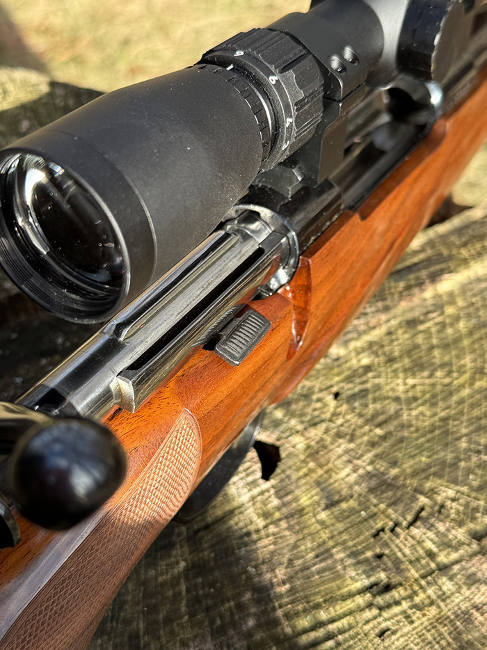 При этом крышка магазина открывается снизу, так что значительно легче это сделать, чем на военном маузере К98, где для открытия магазина нужно нажать патроном или чем-то ещё на винт перед спусковой скобой.