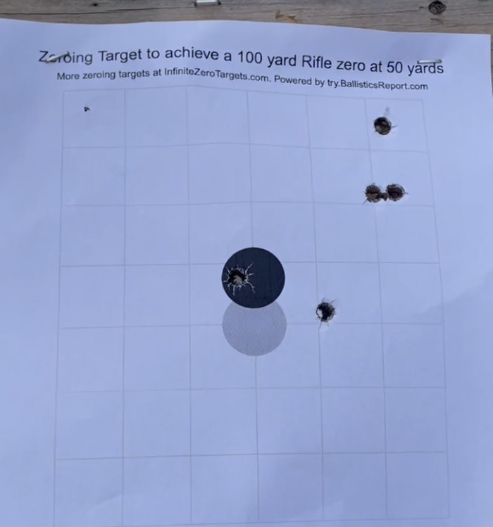 Пристрелял. Последний выстрел - в кружок. Можно чуть подвинуть направо, но в принципе для охоты - большего не нужно. Сейчас уверенно могу попасть в мишень размером где-то 20х20 см на расстоянии 250 метров.