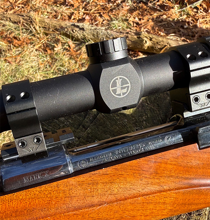 Да, прицел это уже я поставил, сейчас поближе покажу. А так на винтовке прицельных вообще не было - ни мушки, ни целика, только отверстия под установку оптики на ствольной коробке. И да, я купил прицел от компании Leupold, я крутой (кто не знает - мажористая компания довольно)!! )))
