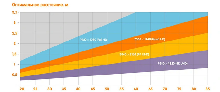 Возьмем для примера самый популярный размер диагонали для современных ТВ — 55 дюймов. При разрешении Full HD картинка будет выглядеть максимально чётко вплоть до 2,5 метров от устройства. Это и есть то расстояние, на котором смотрят ТВ такого размера большинство людей. При использовании современной модели 4К такой же диагонали вы сможете наблюдать идеально гладкое изображение уже с расстояния 120 сантиметров от экрана.