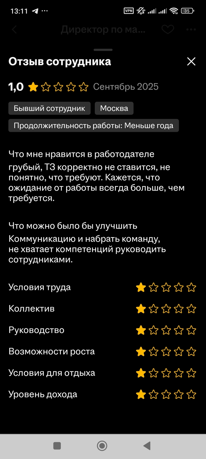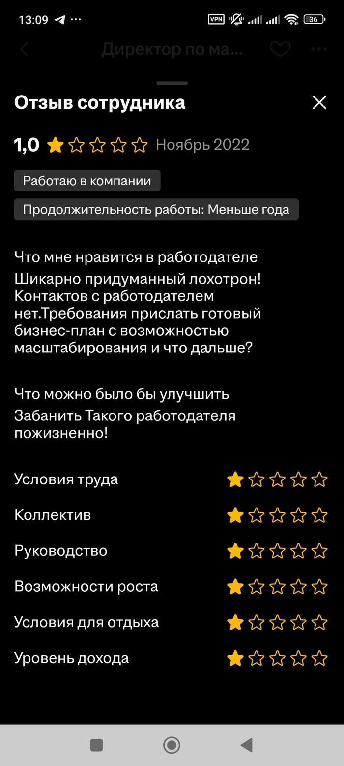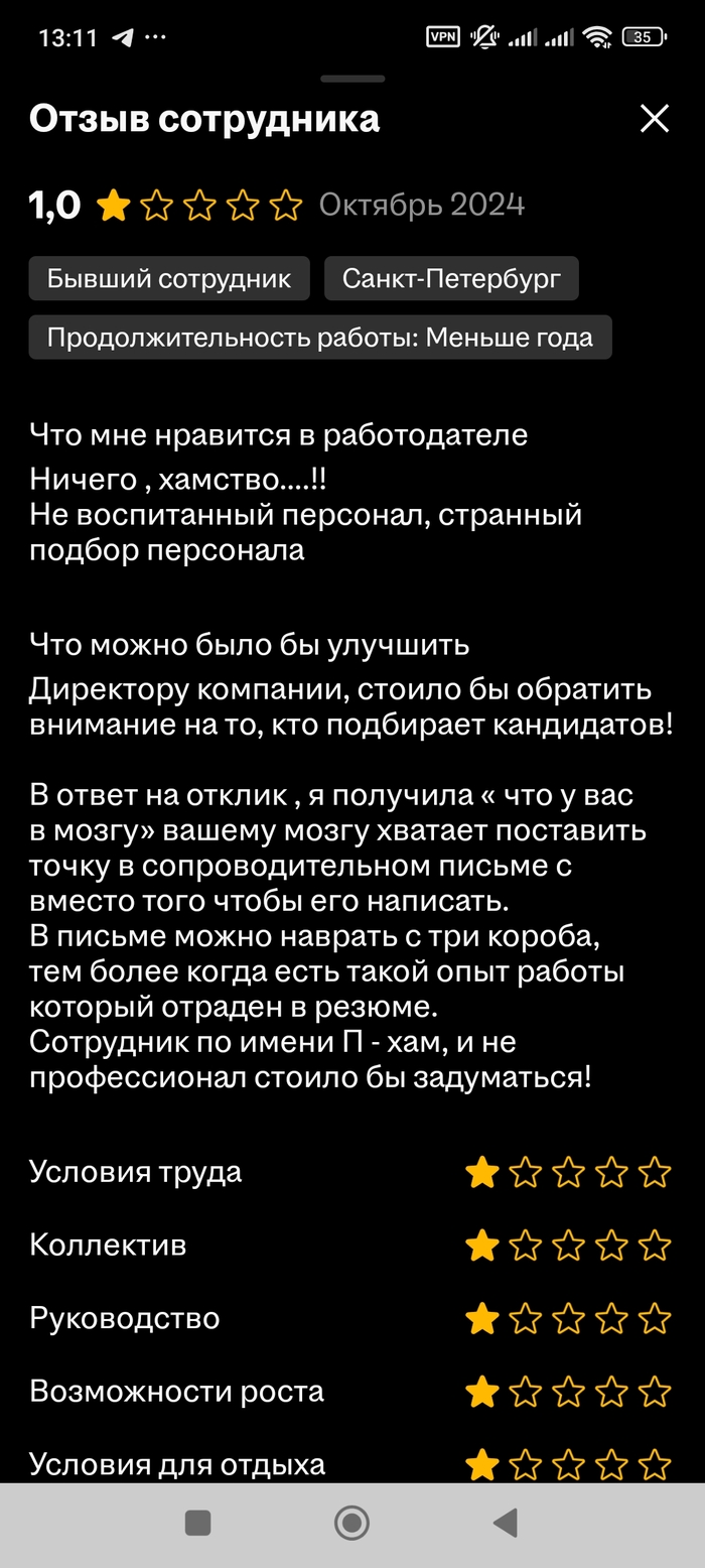 9 bigyellowstar Агент СНТ Интересный работодатель 3 месяца назад Я на HH.ru впервые сталкиваюсь с таким общением от работодателя. Решил перечитать вакансию и посмотреть отзывы. И действительно кажется я идиот раз откликнулся А вот и отзывы о нем Показать полностью 12 [моё] Работа Вакансии HH Длиннопост Скриншот Ещё 0