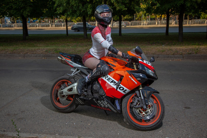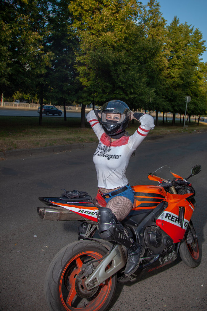 Харли Квинн стояла у спортивного мотоцикла Honda Repsol.