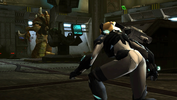 - главный герой лечится с помощью специальных контейнеров, которые переносит напарник-дроид, сами контейнеры пополняются на точках сохранения;