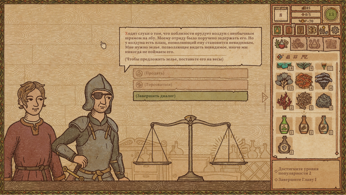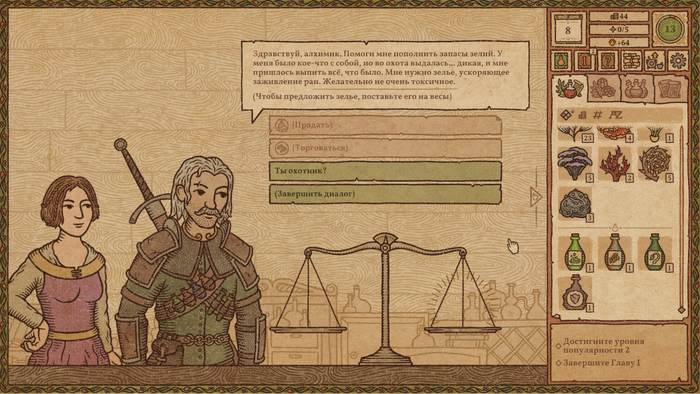 Найдя нужную последовательность трав и узнав, какое зелье из него получается, вы можете сохранить рецепт в книге. И это очень полезно, так как вам не нужно каждый раз выстраивать последовательность трав вручную. Однако свободных страниц мало, а дополнительные покупаются у торговцев, которые то и дело заглядывают в лавку. И чем точнее вы попадаете в “результат”, тем качественнее выходит зелье. А значит его можно продать по более выгодной цене. Только вам выбирать, продавать много дней слабые эликсиры и получать стабильную зарплату и небольшой прирост к репутации. Но при этом не тратить много трав на каждую баночку. Или же потратить время на то, чтобы найти идеальный маршрут, закупить нужные редкие травы у бродячих торговцев и грести после этого золото с репутацией лопатой.