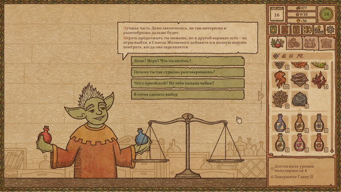 И по факту авторы не ограничивают вас. Вы можете бесконечно продавать зелья день ото дня, выстраивая свою лабораторию в подвале, чтобы сделать, наконец, “Камень пустоты”. Однако сделаете вы это лишь для галочки, так как сюжетно это пока никак не увязано.