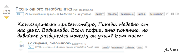 Сижу, листаю "горячее". Как и должно было произойти, я наткнулся на пост "Песнь одного пикабушника".Уже было начал его читать, как вдруг меня озарило: "Мне ведь абсолютно пох.. на эти новости, на эти ники, тем более когда об этом повествует какой-то левый чувачёк, без году неделя существующий на Пикабу"