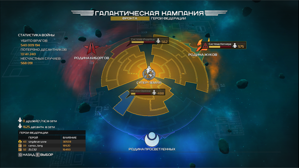 После того как проходим обучение нам дадут крейсер и отправят в вольное плаванье насаждать демократию . Карта на его мостике устроена максимально просто: в центре — Родина, вокруг — враги. Справа — жуки, разумные и не очень. Слева — Роботы, хотя частично человеки . А снизу просветленные, вообще они на за мир ,но объявить войну в превентивных целях не повредит. Наша цель проста, захватить всё.Карта динамична и не защищая определённые регионы можно оказаться в гарнизоне супер-земли и из последних сил спасать свою родину.