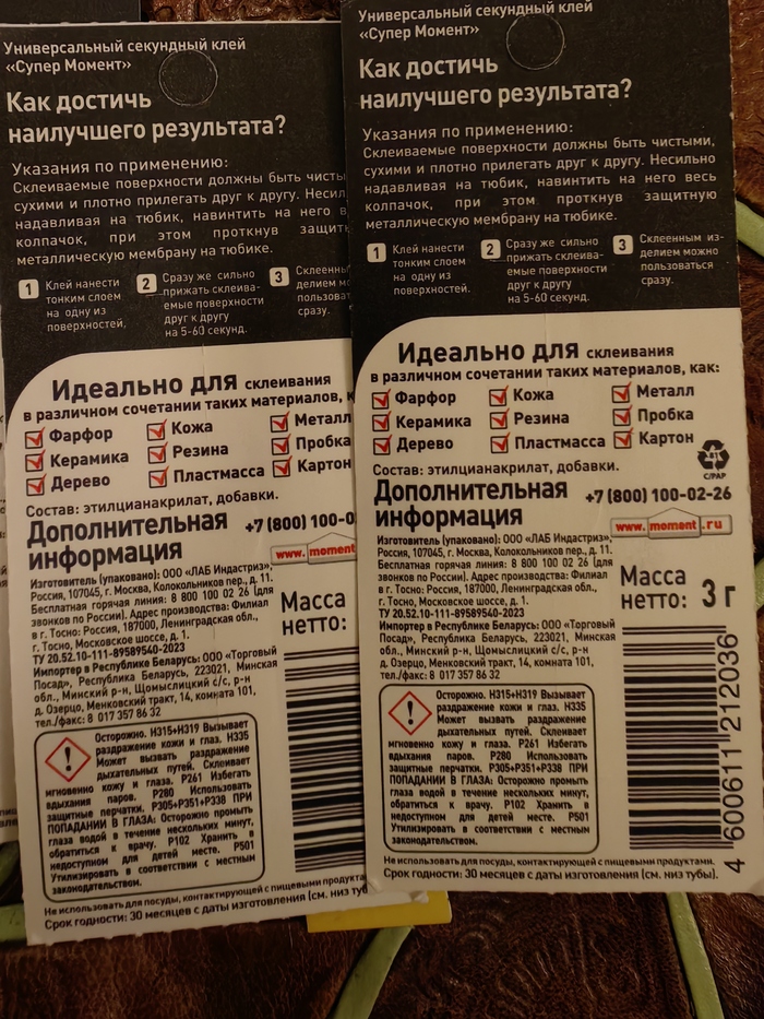@Ozon, можете что-нибудь сказать, кроме шаблонных ответов про сертификат? Который на самом деле и не сертификат, а свидетельство о соответствии. Кстати, вот оборотная сторона упаковки супер клея и присланное поддержкой же Озона свидетельство. Что-то не бьется изготовитель, не?
