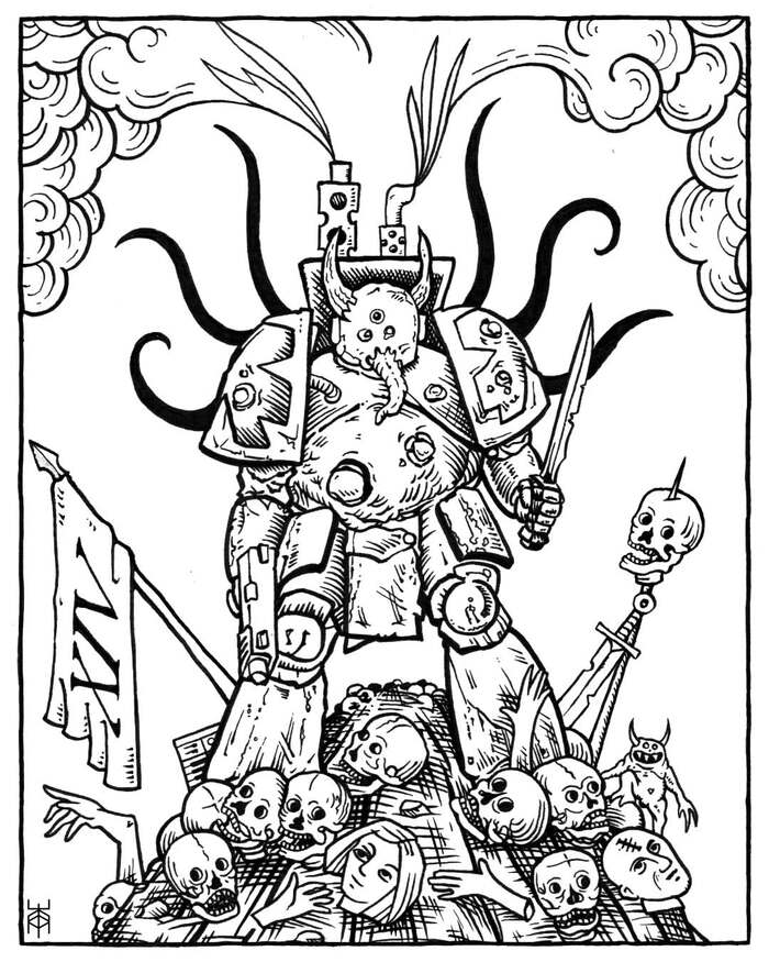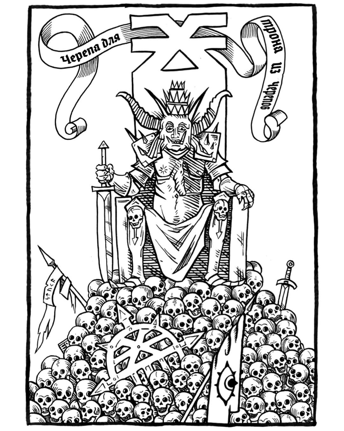 Пластиковый трон («Золотой Трон» из стульев), гирлянды («варповые штормы»), ёлка с игрушками-черепами.