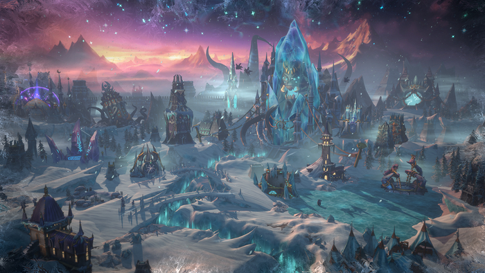 Во-первых, невооружённым взглядом видно, откуда ноги растут. Здесь тебе и тентакли, растущие из всех возможных мест, в том числе и в городе, и огромный "К'тулху", вмороженный в глыбу льда в качестве главного здания фракции, и снежный биом с бегающими по окрестностям пингвинами-альбиносами, и вся эта тема с культистами и Бездной. Короче, Лавкрафт как он есть.