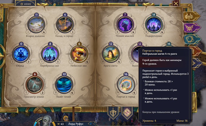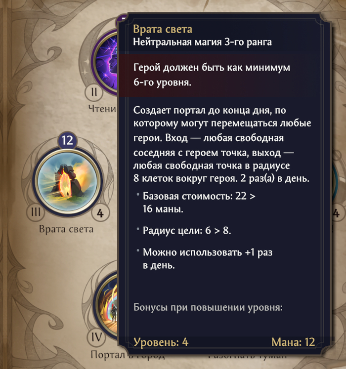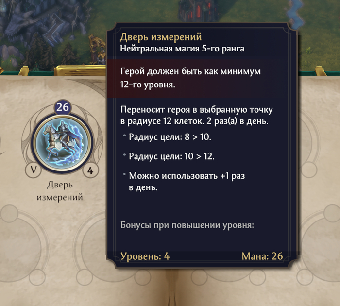 С другой стороны, порадовала походная магия вроде двери измерений, полёта и городского портала. Теперь эти заклинания не принадлежат ни одной из 4-х школ, а их изучение требует только определённого уровня героя. Эта магия работает как часы. Есть в ней и новые заклинания. Например, на один ход герой может создать два портала (вход и выход), которыми могут пользоваться все герои игрока. Полезность заклинания предстоит ещё выяснить.