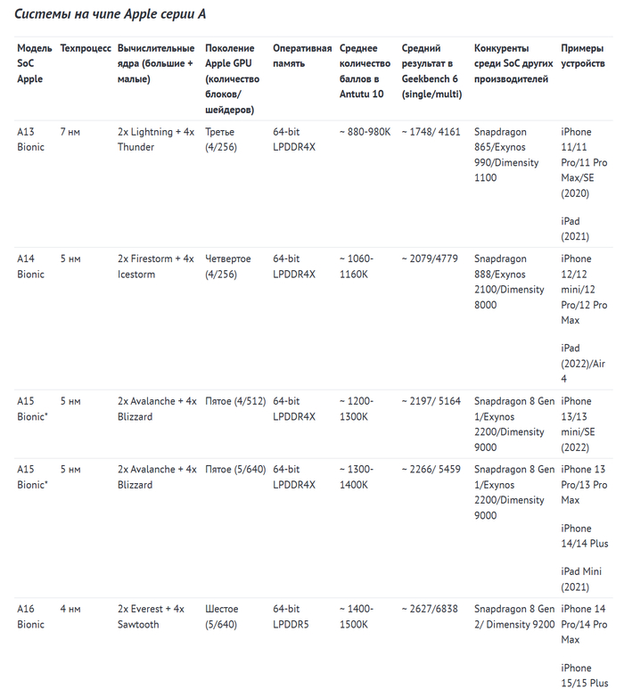 Стоит помнить, что сравнивать результаты SoC Apple и процессоров других производителей на Android/Windows устройствах можно только для того, чтобы сложить общее представление о их производительности. При схожем количестве баллов те же программы и игры на «яблочных» устройствах (если они там есть) могут работать немного быстрее. Это достигается за счет того, что Apple использует собственные ОС со множеством оптимизаций под свои чипы.