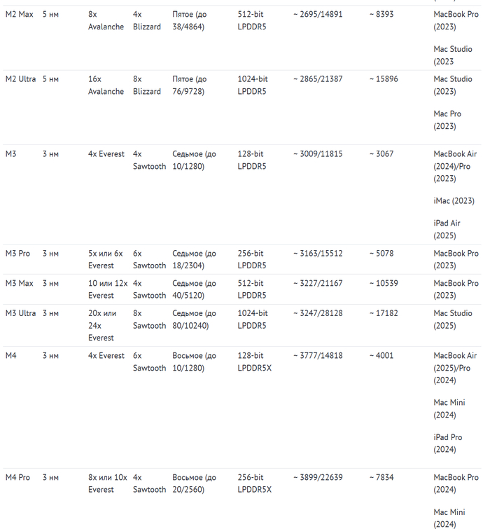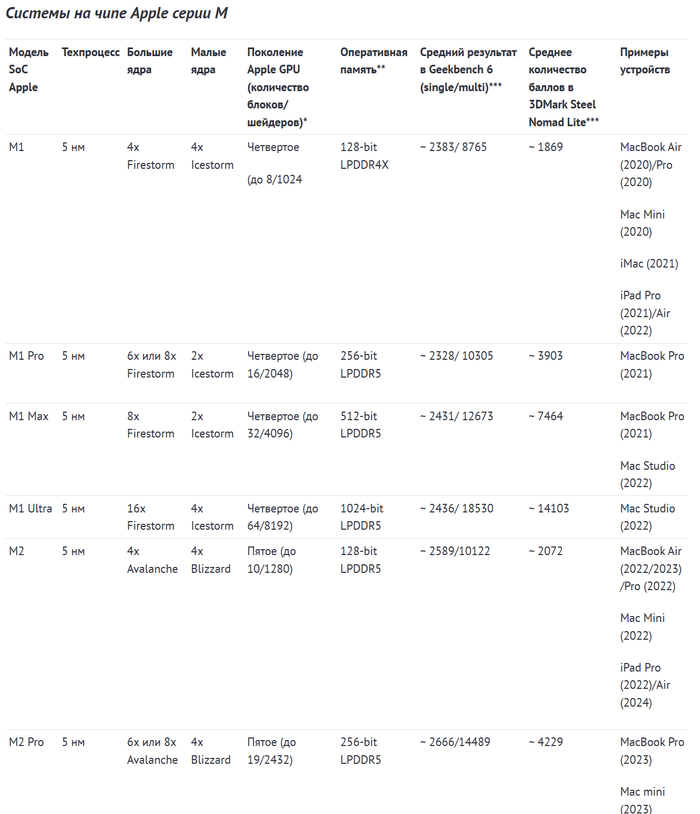 В таблицах ниже можно увидеть основные характеристики и результаты в бенчмарках актуальных систем на чипе Apple.
