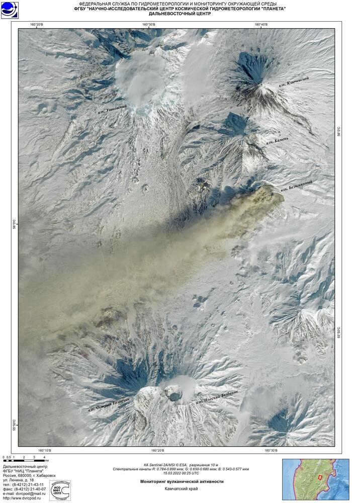 На сайте Японского метеорологического агентства (спутник Himawari-8) https://www.eorc.jaxa.jp/ptree/index.html, если установить дату 2022-03-15 03:00 (или любое соседнее время +- 2 часа), то можно увидеть пепловый шлейф светло-коричневого цвета