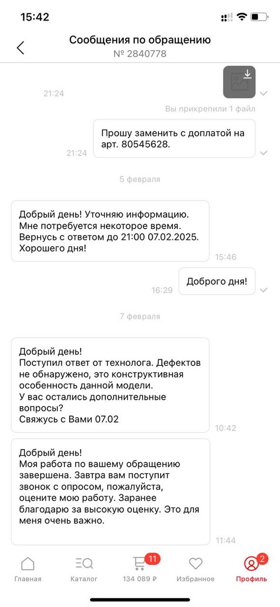 В обращении написали, что технолог заключение передаст 09.01 25 г. После позвонила девушка, сообщила, что замена согласована и уточнила даты доставки