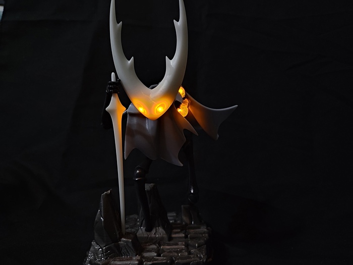 Всё началось с того, что приобрел себе FDM 3д принтер для работы и хобби и захотелось изготовить подарочек для брата. Он любил Hollow Knight, поэтому нашел в интернете готовые модельки и отпечатал их. Только 3д модель меча Рыцаря переделал, сделав его рельефным.