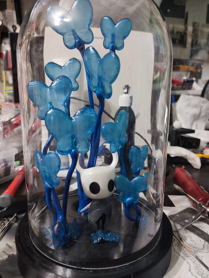 Идея была следующая у заказчика: захотелось рыцаря из Hollow Knight, в окружении бабочек-растений из определенной локации, да так, чтобы эти бабочки светились! Ну и всё сверху колбой закрывалось.