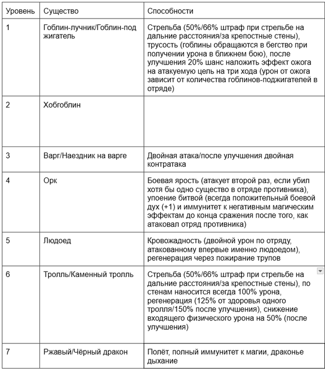 Расположившиеся на втором уровне фракции более крепкие и рослые хобгоблины выполняют роль лёгкой варварской пехоты. У них высокие инициатива, скорость и параметр атаки для своего уровня. Плюс, опять же, завышенный прирост.