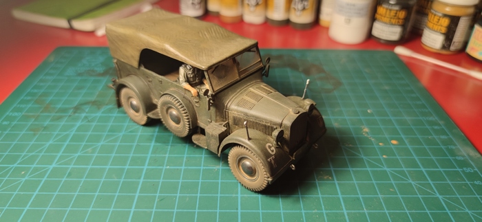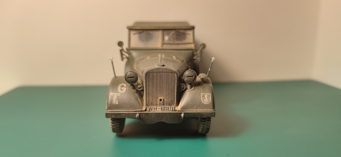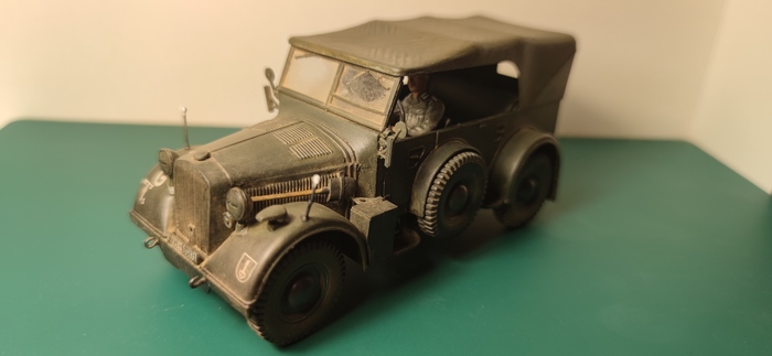 "Ну, больше не меньше", подбодрил меня внутренний моделист. В итоге солдаты покрашены, тачка собрана, приклеены декали, покрыта глянцевым лаком, на него смывка, матовый лак. Осталось дело за малым - приклеить пластиковые стекла. И тут выясняется, что клей для сборки модели не очень для поклейки стекол. Они мутнеют от него. Опять - гугл, шлифовка, 2 часа кропотливой работы и результата ноль. "Давай зафигачим все пылью. Зря пигменты покупали, штоле? Заодно запоротые стекла спрячем. " - не унимался моделист. Естественно, пигментов было нанесено столько, что штабной хорьх стал выглядеть, как кучка пыли, а не как служебная тачка Гудериана. Оттираем все ухочистками часик. Ну и вот итог. До пигментов было лучше. Но нам, с внутренним моделистом понравилось.