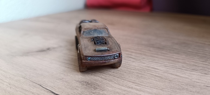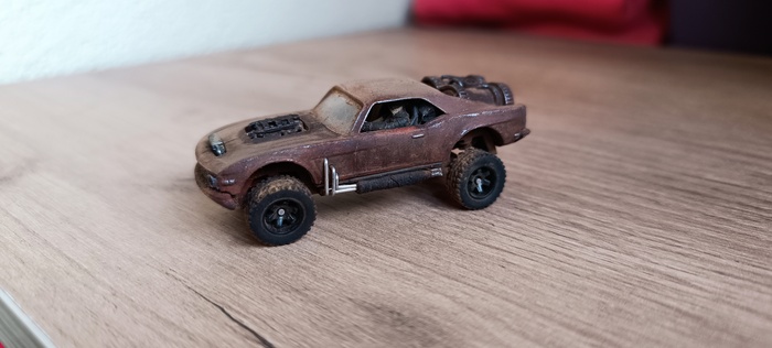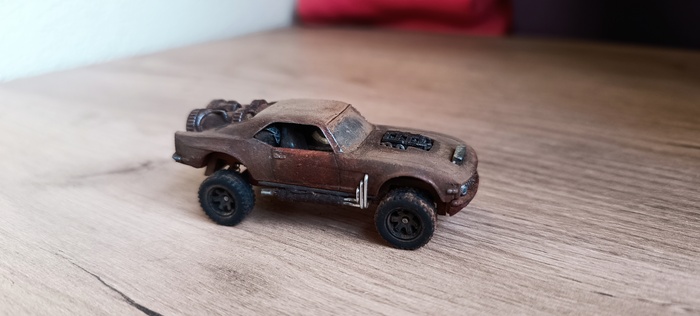 Моя первая модель. От оригинала только кузовщина. Рама, водитель, двигатель, бочка напечатана на 3D-принтере. Использовал также пластиковую карту и ПВХ 3мм. Колеса - заказ с Али. Окраска акрилом кистью и губкой. Давно мечтал сделать кастом модель 1/64 в постапокалиптическом стиле.