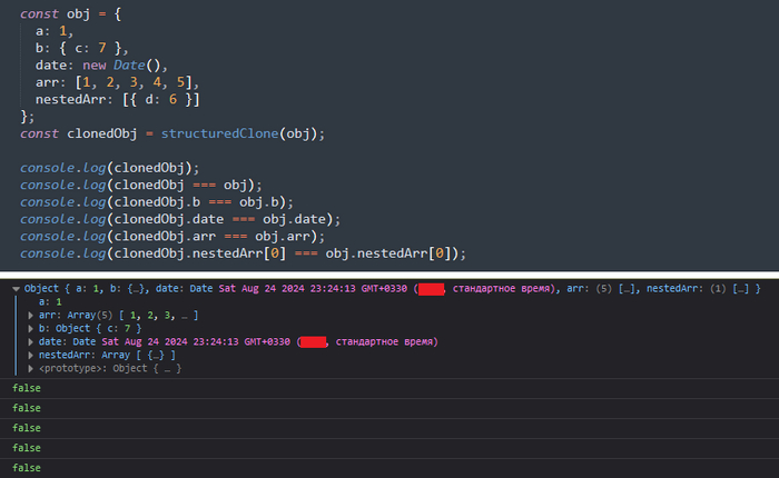 Структурированное клонирование – метод создания полной (глубокой) копии объекта, включающей все вложенные объекты и структуры данных. Функция structuredClone позволяет выполнять такое клонирование просто и эффективно – в отличие от JSON.parse(JSON.stringify()), structuredClone корректно обрабатывает Date, Map, Set и другие специальные типы JavaScript: