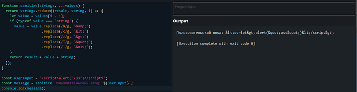Теговые шаблоны позволяют разбирать шаблонные литералы с помощью функции. Первый аргумент такой функции содержит массив строковых значений, а остальные содержат выражения из подстановок. Здесь, например, функция sanitize заменяет опасные символы на их безопасные HTML-сущности, предотвращая выполнение нежелательного кода: