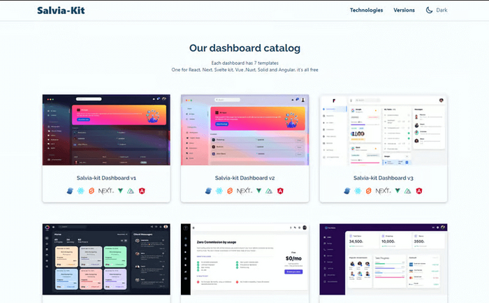 Salvia Kit предлагает коллекцию Angular-, React-, Vue-, Nuxt- и Svelte-шаблонов. Отличается широким выбором шаблонов для административных панелей.