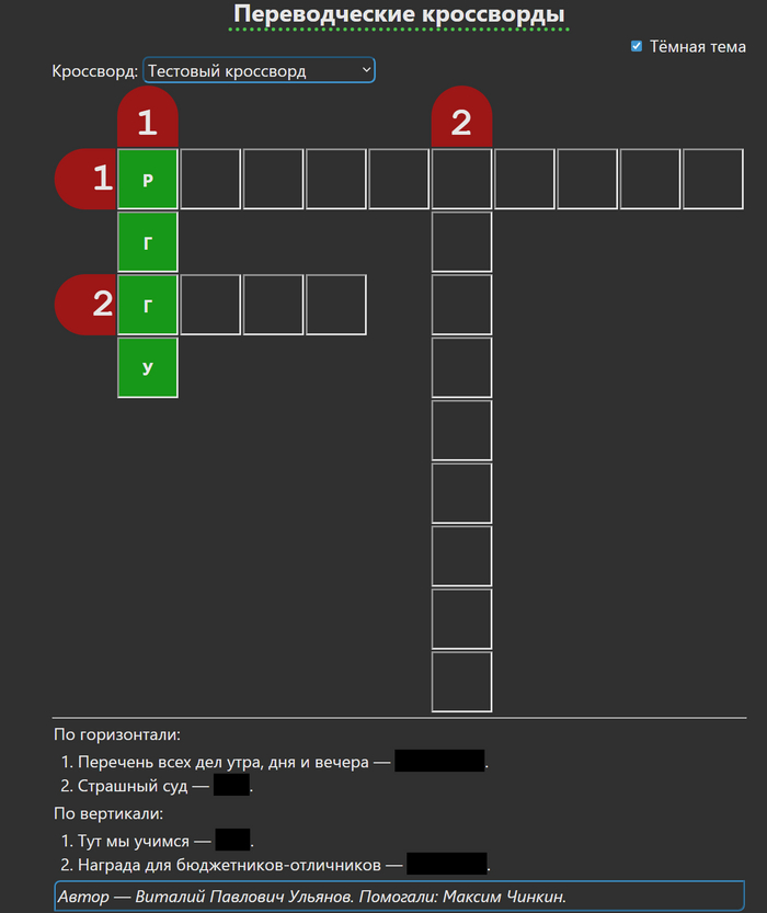 По состоянию на 20 декабря конструктор стал ещё чуточку лучше: я добавил в него галочки для понимания, какие из загаданных слов уже находятся на сетке, а также кнопки перемещения слова или слов и кнопку сохранения результата.