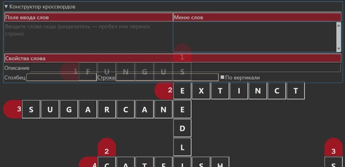 12 декабря я наконец-то приступил к созданию конструктора кроссвордов, дабы навсегда оставить расстановку всего и вся в массиве строк в прошлом. И вот первая версия конструктора уже позволила добавлять слова и редактировать их описание и положение на сетке.