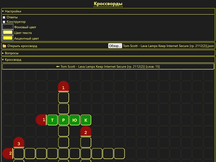 Желающие опробовать показанное мной самостоятельно могут найти мои творения на GitHub (старые кроссворды на данный момент лежат в папке Crosswords, а новые — в New Crosswords, позже я переименую их соответственно в Old Crosswords и Crosswords, чтобы подчеркнуть переход к обновлённому варианту).