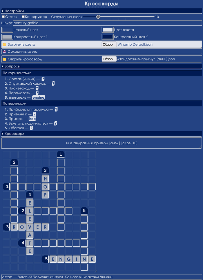 Вот такое у гуманитария выдалось приключение. Я прекрасно понимаю, что претендовать на образцовое качество вряд ли могу, что программ с кроссвордами не хуже моей пруд пруди и что опытного человека не удивишь чем-то, что он напишет максимум за день, но для меня это личное достижение и приятная возможность сделать что-то своё, что при этом будет неплохо служить моим преподавательским целям и радовать студентов.