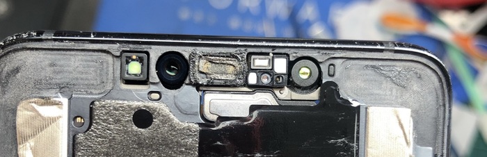 Слева направо: Dot projector/ фронтальная камера/ верхний динамик/ сборка, которая состоит из датчика приближения, датчика освещения и флюда(дальнометра)/ инфракрасная камера.