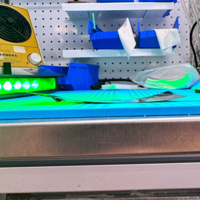 Чистим матрицу толщиной с лист бумаги в антипылевой комнате под зелёной лампой и склеиваем её с новым стеклом в вакуумном прессе.