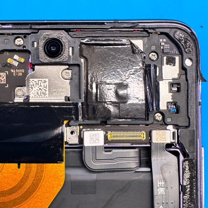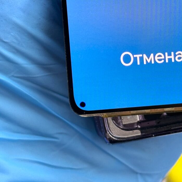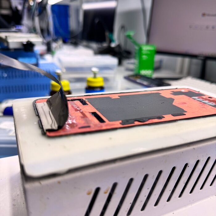 Для начала нам нужно зафиксировать дисплей. Спереди у нас разбитие, а сзади у нас шлейф матрицы, и он просто не поместится на сепаратор, но мы сделаем финт ушами и отогнём шлейф матрицы, отклеив его от подложки.