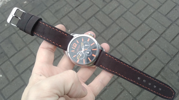 Ремешок для мужских часов Boss с яркой прошивкой. Ремешок стандартной длины. Пряжка переставлена фирменная.